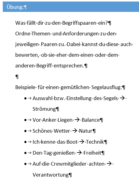 Alle Parameter gleichzeitig zu berücksichtigen ist schier unmöglich. Deswegen strukturieren wir unser Segelabenteuer, ähnlich wie wir es mit komplexeren Aufgaben zu Hause oder im Beruf tun. Haben wir mal eine Struktur können wir effizienter Entscheidungen treffen und handeln. Fürs Segeln können die Komplexität zwischen drei sich ergänzenden Begriffspaaren aufspannen, zwischen denen wir ein Gleichgewicht suchen – drei Paare, die ständig zwischen Ent- und Anspannung schwingen. Wir haben mal das Paar „Strömung und Balance“, das die Themen rund um das Erlernen des Segeln umfasst. Mit dem Paar „Natur und Technik“ spannen wir einen Bogen zwischen den Natürlich gegebenen Bedingungen und unsere Ausrüstung bzw. unseren Sicherheitsmaßnahmen. Und nicht zuletzt packen wir unsere persönliche und soziale Disposition unten den Begriffen „Freiheit und Verantwortung“. Jedes dieser Paare kann Zufriedenheit geben und in jedem ist ein Stück Glück zu finden. Ziel dieser Übung ist es, Komplexität zu ordnen und zu reduzieren.