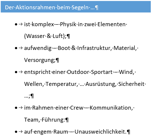 Fasst man alles zusammen, behaupten manche Autoren und Sporttrainer zu recht, Segeln sei die komplexeste Sportart überhaupt. Segeln bedeutet eine ständige Auseinandersetzung mit u.a. Wetter, Material, Gruppenstrukturen, persönlichen Bedürfnissen und Anpassungs- bzw. Lernprozessen. Diese Komplexität bringt es mit sich, dass wir die Anforderungen an uns selbst gerne unterschätzen.